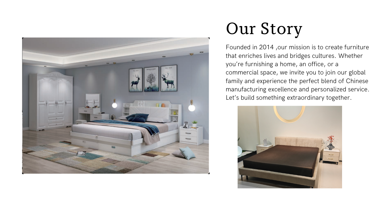 Foshan Jiehan Furniture company was established in 2014 and specializes in furniture:including bedroom, dining room and living room furniture.